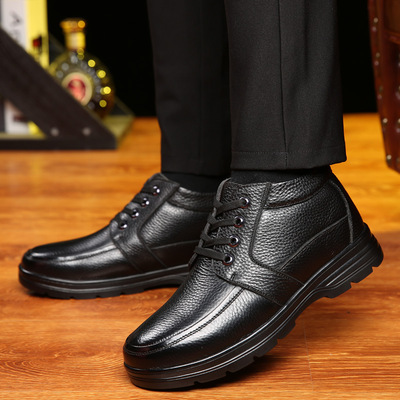 Men's Cotton Warm-Keeping Fleece-Lined Winter Shoes: Genuine Leather & Wool, Mid-to-Late Adult Style, Lace-Up Design, Made from Premium Cowhide—Available in Plus Sizes for Dads
