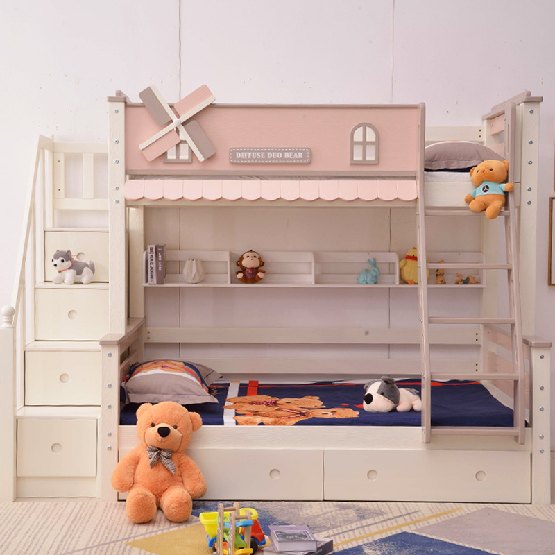 Modern minimalist solid wood frame double-layered bed for girls, princess style, children's bed, suitable for small household bedrooms, high-low bed