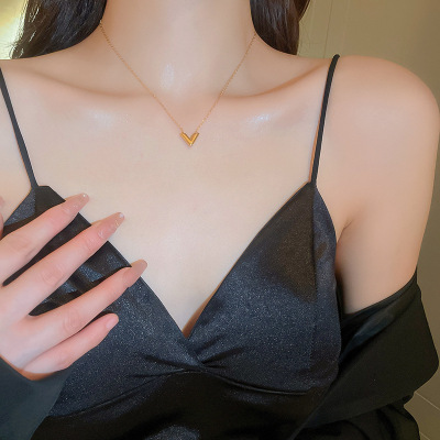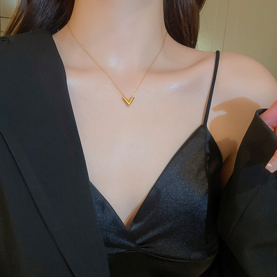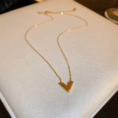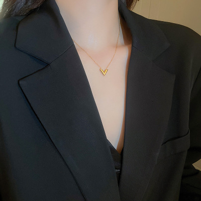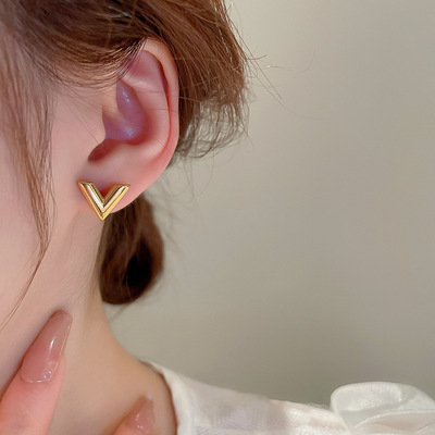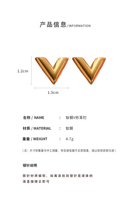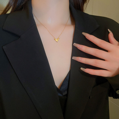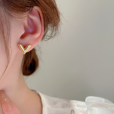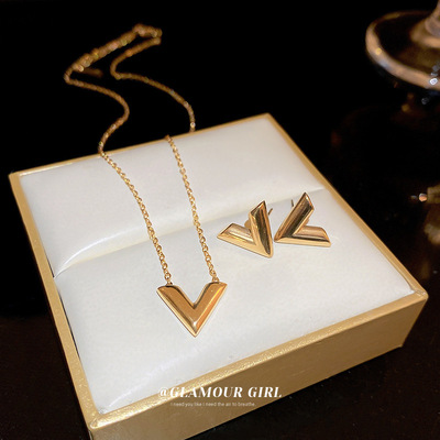 Gold titanium steel V-shaped earrings and necklace set, fashionable, simple and versatile metal style earrings, personalized design jewelry