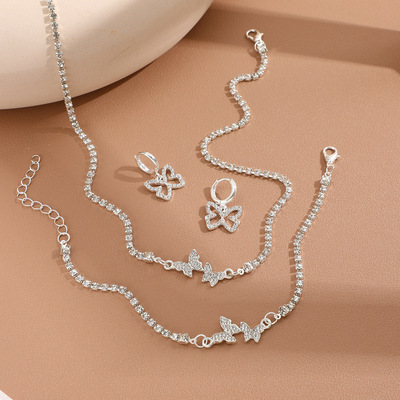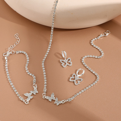 GIRL'S NEW STYLE FRESH AND SWEET DIAMOND-DECORATED BUTTERFLY NECKLACE EARRINGS AND BRACELETS LUXURY HIGH-QUALITY SHINY SILVER JEWELRY SET