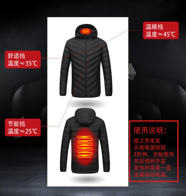 USB Smart Temperature Control Heating Jacket for Autumn/Winter, Unisex, Detachable Zip Hat, Heatable Cotton Coat