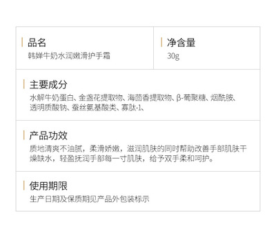 產品名稱:韓嬋牛奶水潤嫩滑護手霜250ml