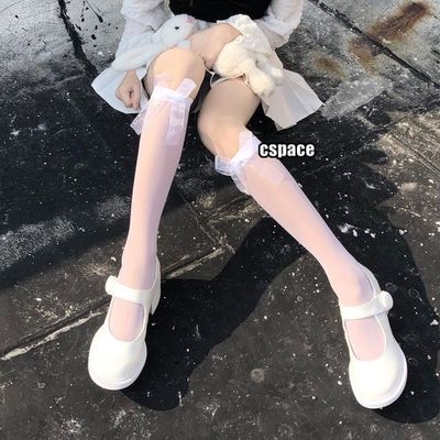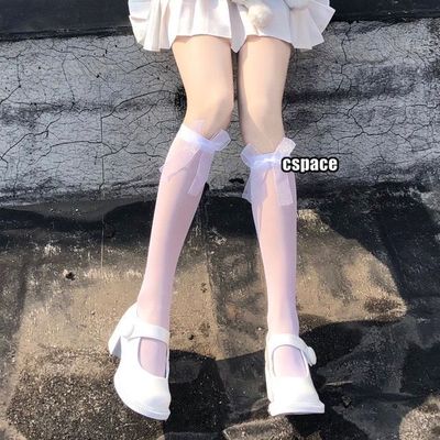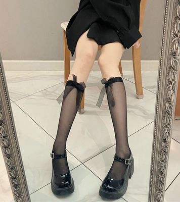 Japanese-style bow-patterned calf socks for women, Instagram-famous trendy black stockings—summer thin style, JK mid-calf length, perfect for Lolita looks.