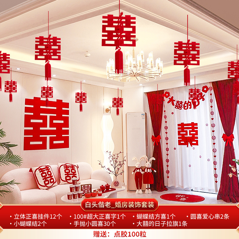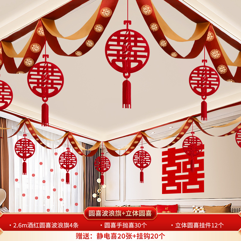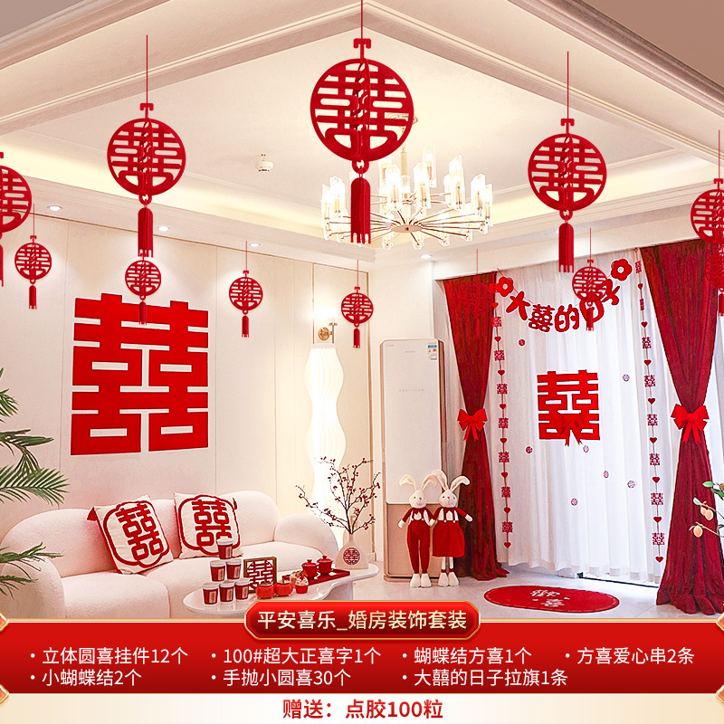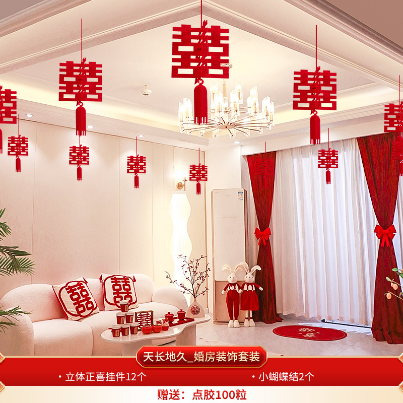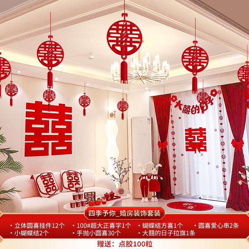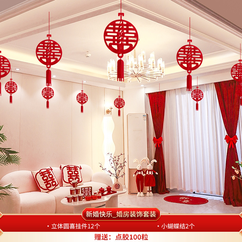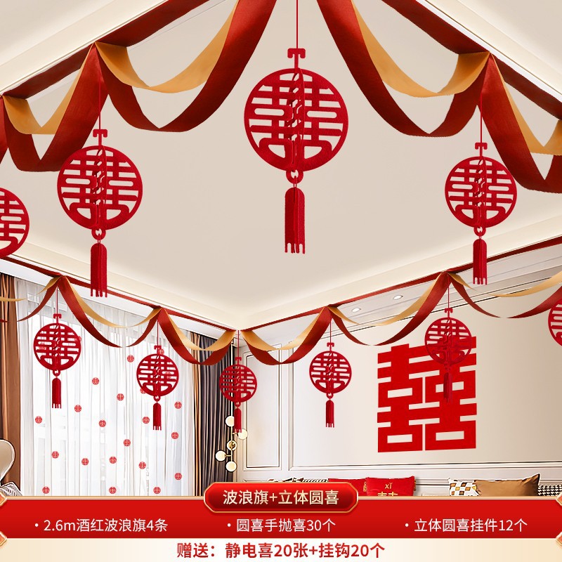 Wedding decoration set for the groom's new wedding room, including ceiling draperies for the living room, paper couplets for the bride's room, and overall wedding room arrangement.
