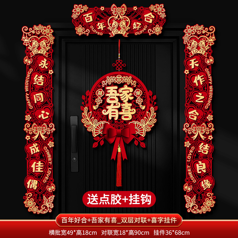 Double-layer couplet "May You Have a Hundred Years of Happy Union" + "My Home Has Good News" + Happy character pendant