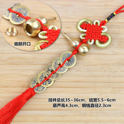 Polished golden gourd + copper Five Emperors coins, red small knot