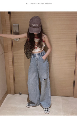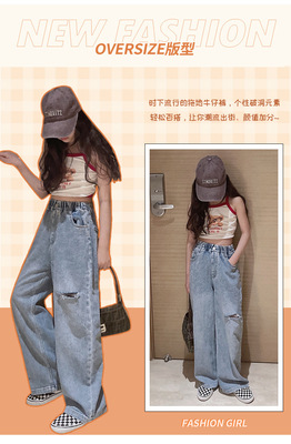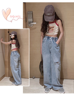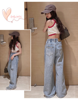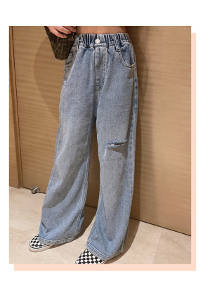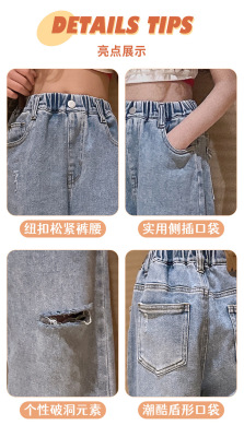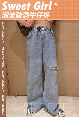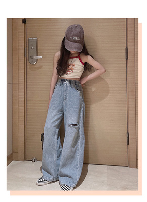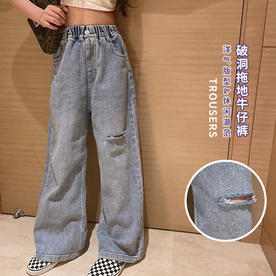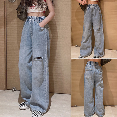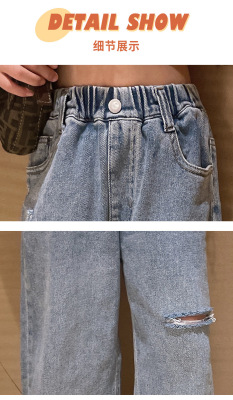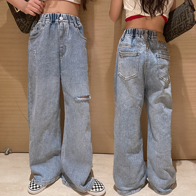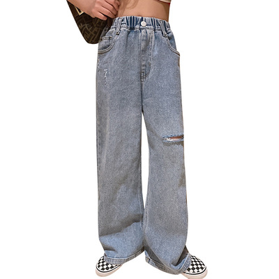 Children's Hole-Drop Denim Pants 2024 Spring New Medium and Large Children's Autumn High-Waisted Loose Wide-Leg Pants