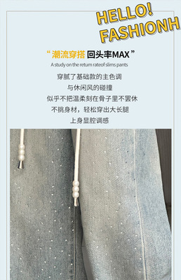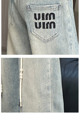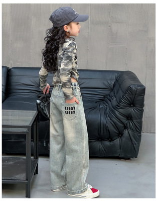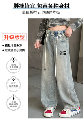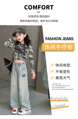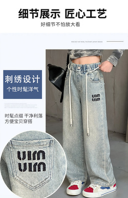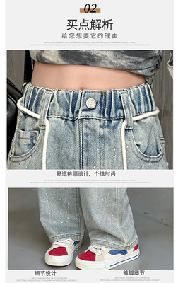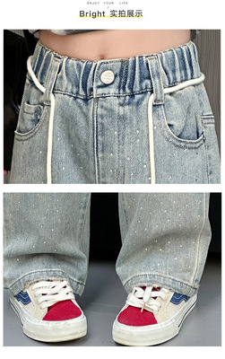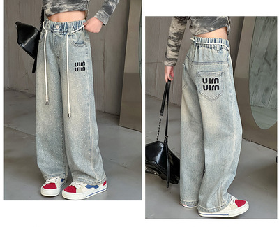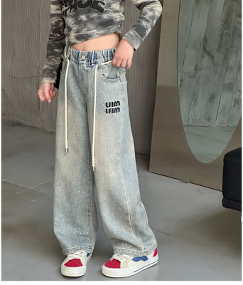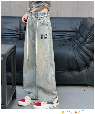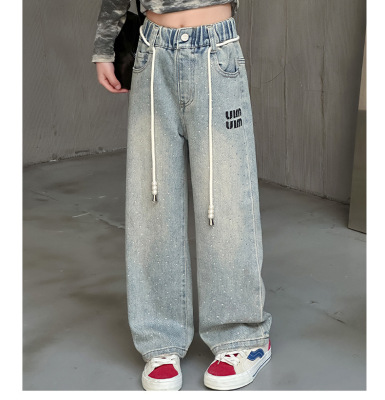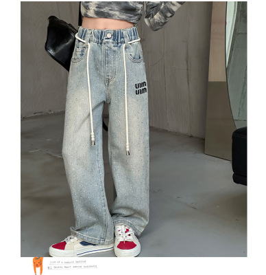Children's Embroidered Denim Jeans with Rhinestones 2024 Spring Foreign Trade Children's Denim for Older Children Korean Style Loose Denim Pants for Girls