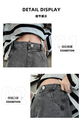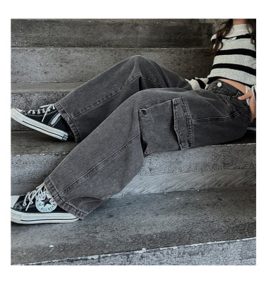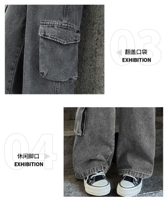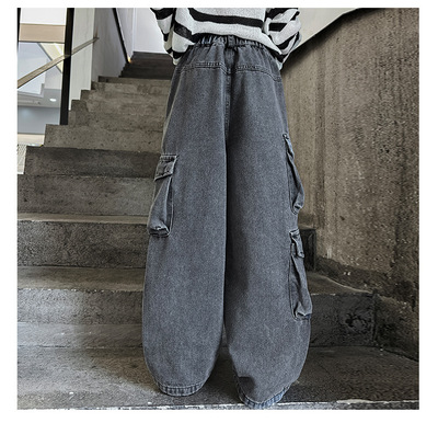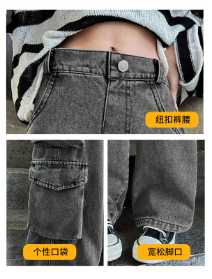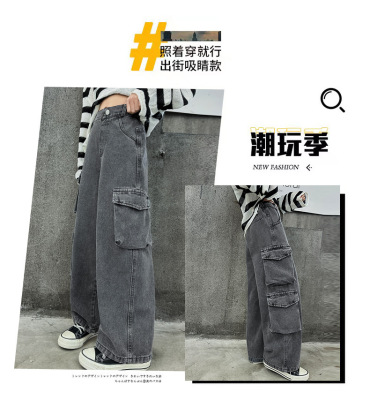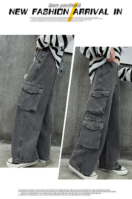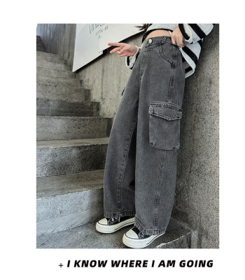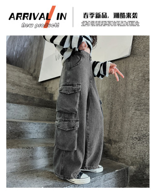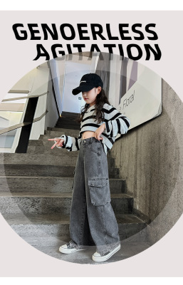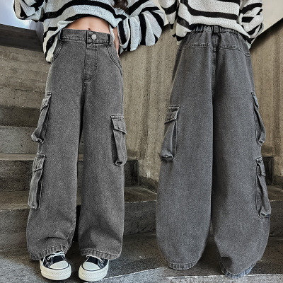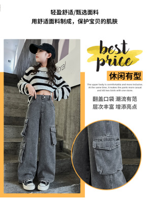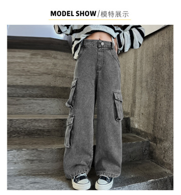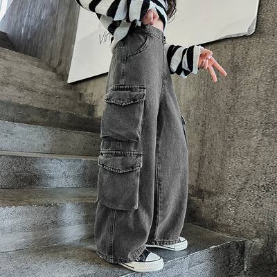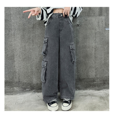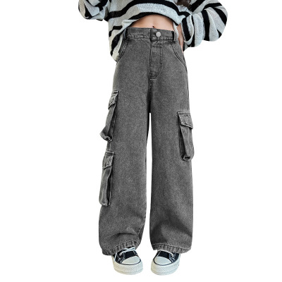 Cross-border Girls' 2024 Spring Denim Workwear Wide-leg Pants for Older Kids Korean-style Trendy Kids' Wide-leg Straight-leg Pants with Large Pockets