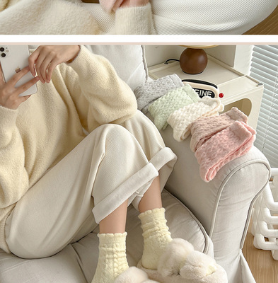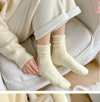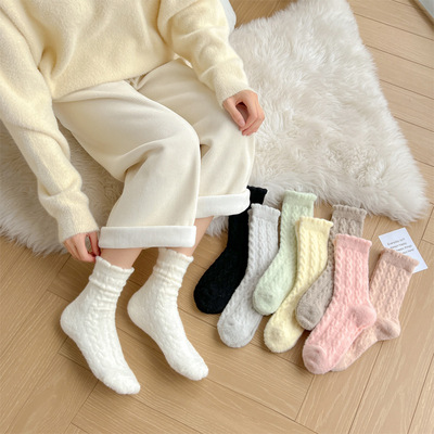 Plush Socks for Women, Mid-Calf Ins Style, Autumn/Winter Fleece-Lined & Thickened, Retro Cable-Knit Design, Colorful Australian Wool Long Socks for Sleep & Warmth