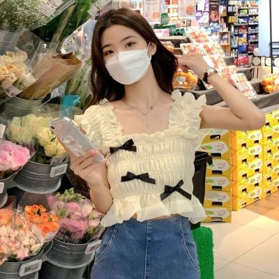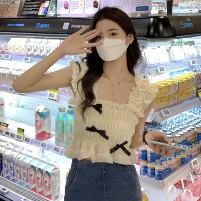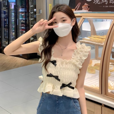 甜美法式木耳邊無袖雪紡衫女春季2024新款方領蝴蝶結修身顯瘦上衣