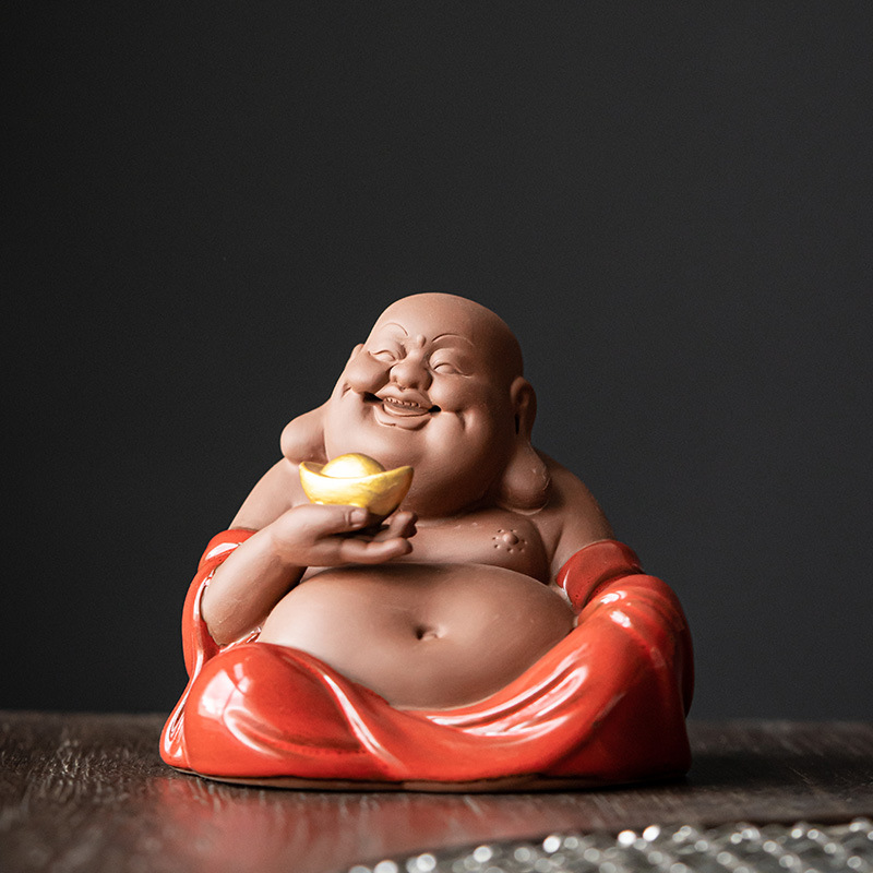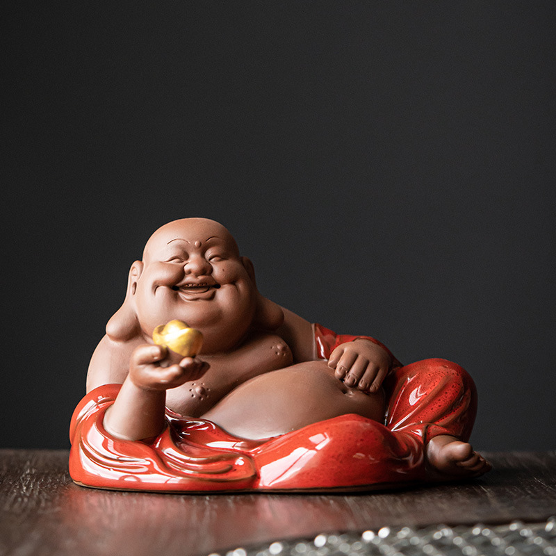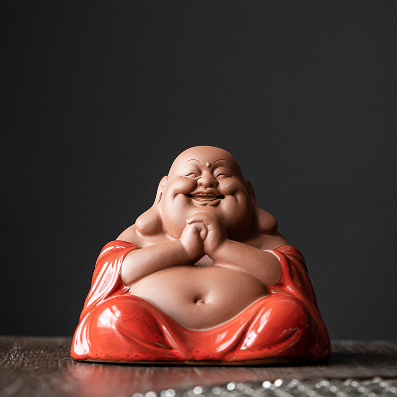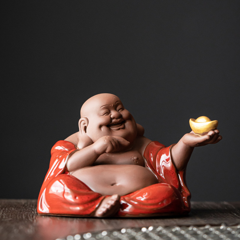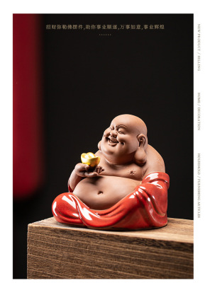 Red Ceramic Maitreya Buddha Laughing Buddha Statue Living Room Craft Art Desktop Decorative Item Zisha Tea Pet Lucky Money Shelf Accent