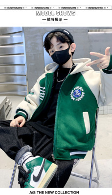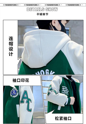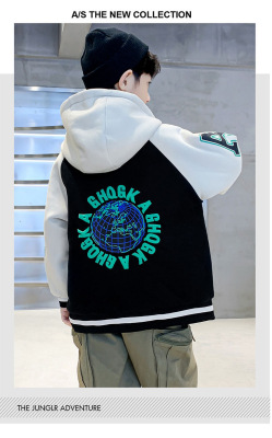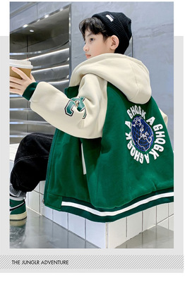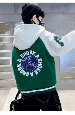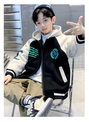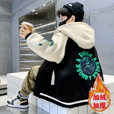 Boys' Winter Thick Fleece Hooded Jacket 2023 New Medium and Large Kids Stylish Plaid Embroidered Cardigan Trend