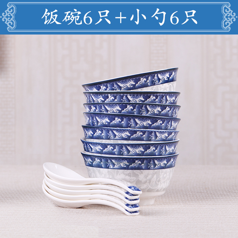 青花瓷碗6/10個裝高檔家用陶瓷飯碗小碗喝湯碗小湯勺餐具套裝