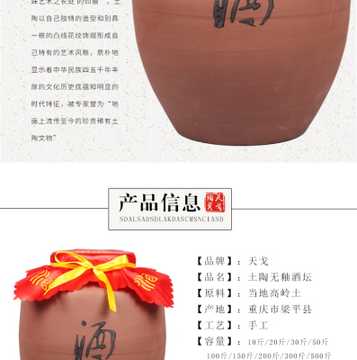Tiange Earthenware Wine Jar, Ceramic Cellar Storage Pot, Vintage Earthenware 10/50-Jin Household Sealed Wine Vessel