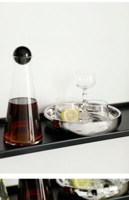 A transparent pot with two cups and a tray, a round tray