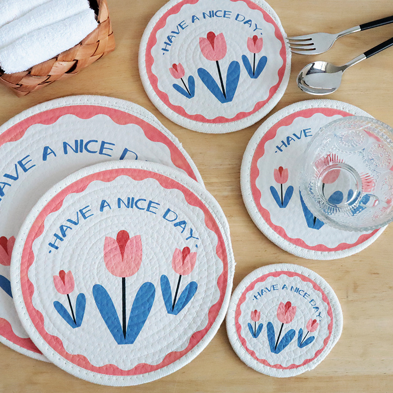 Nordic Sweet Table Mat with Tulip Print Cotton Rope Weaving Heat Insulating Coasters