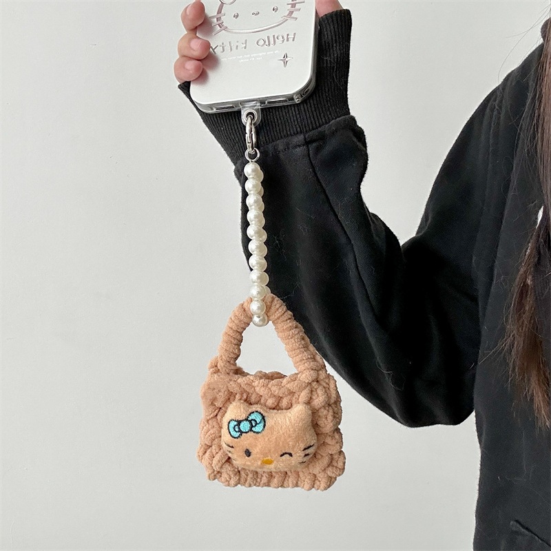 [Brown] Brown leather blue bow kt wool bag + mobile phone chain