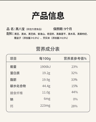 Raw materials and ingredients: black sesame walnut powder, black beans, black wolfberry, black mulberry, black fungus