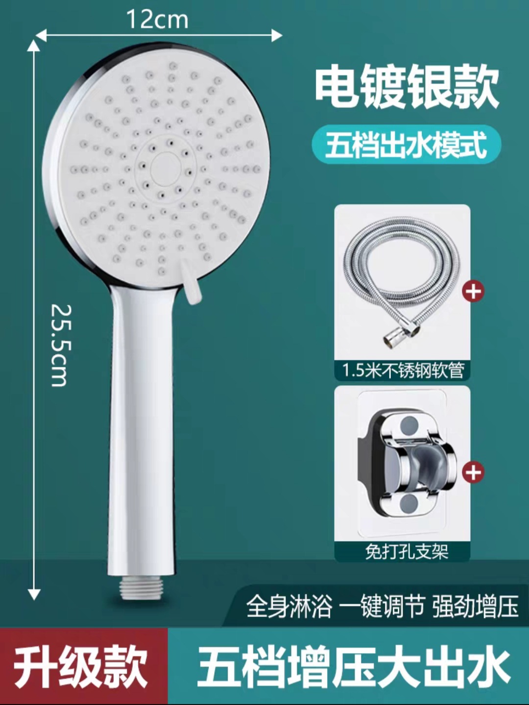 Specifications: Silver five-speed large panel + 1.5-meter silver shower pipe + punch-free base