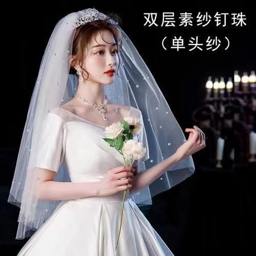 Bridal veil, main wedding dress, pearl puffy style, wedding headpiece, fairy-like, forest-themed, champagne-colored cover, double-layer