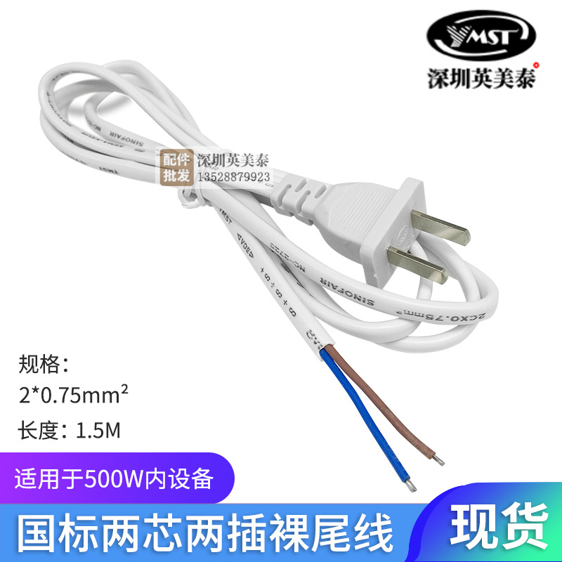 National standard power cord with plug, 2-core, 0.5/0.75 square mm, 2-core power connection cord, two-prong plug wire