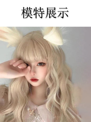 Wig for female long hair beauty blogger, side bangs, summer, realistic and natural, milk tea gold, long curly hair, large waves, full head cover style