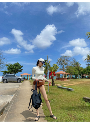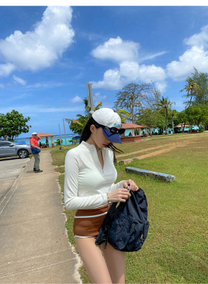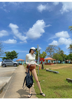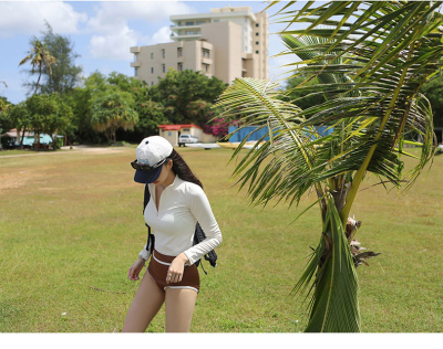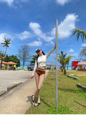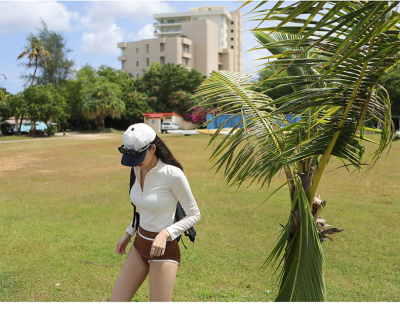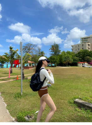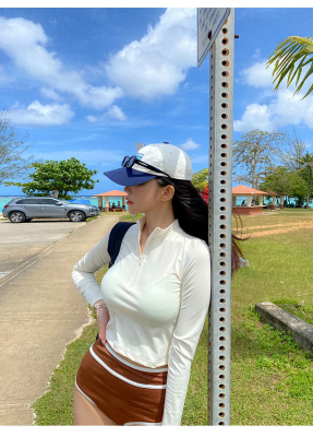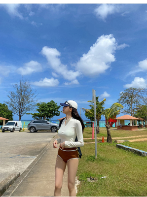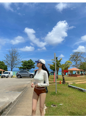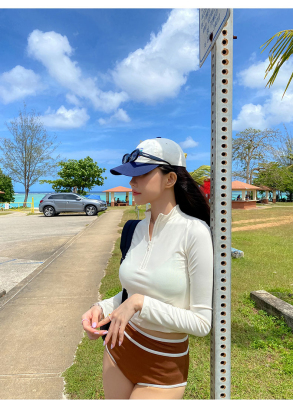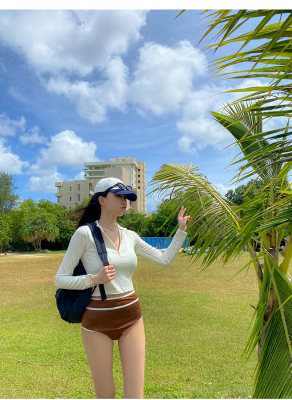 撞色長袖三角比基尼小胸白色防曬運動小胸泳裝帶胸墊泳衣分體