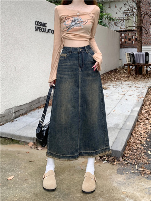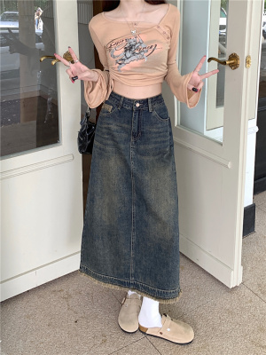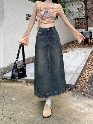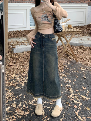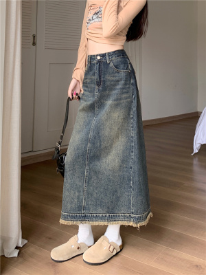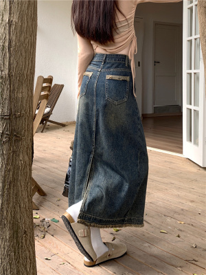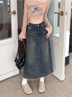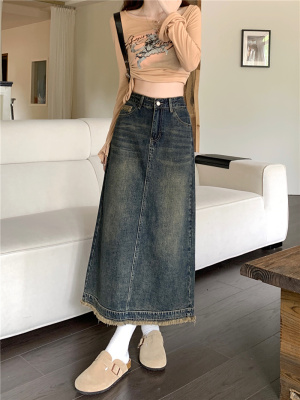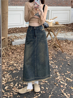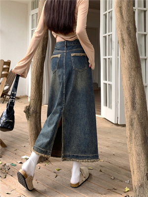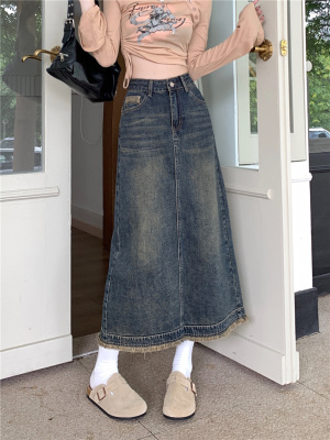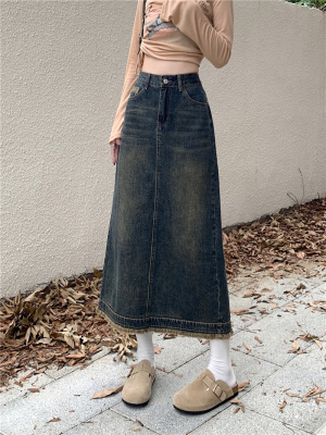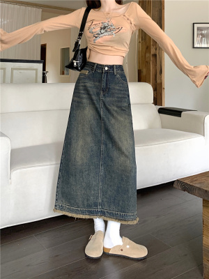 ~New retro slit half-length denim skirt with high waist and slim raw edge design A-line long skirt for women