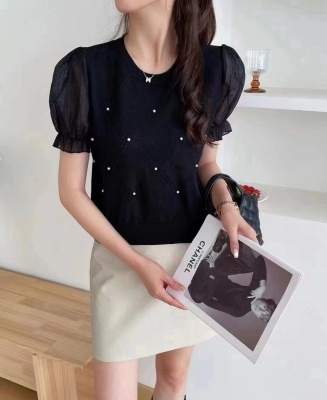 2024 new summer Korean style fashionable and beautiful beaded stitching chiffon puff sleeve short-sleeved top for women