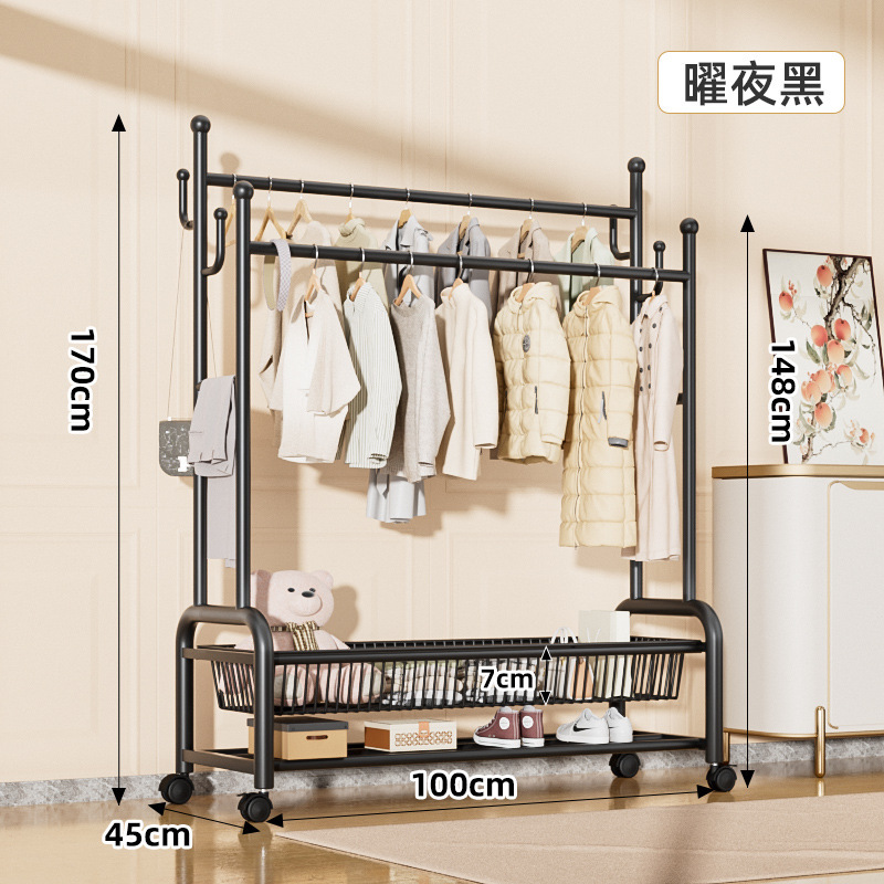 100cm曜石黑—雙排掛衣杆—雙層網籃收納—萬向輪