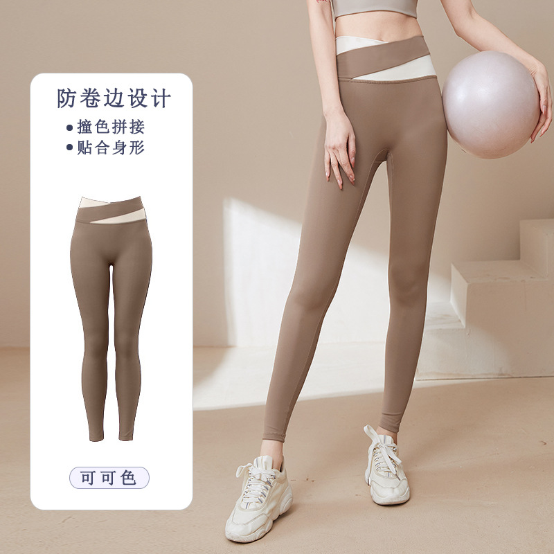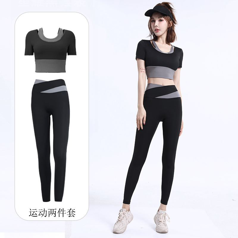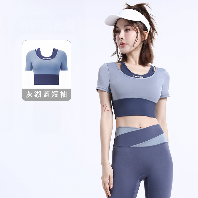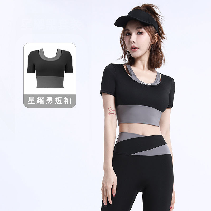 Naked navel-baring yoga clothes for women, sports yoga short-sleeved with chest pads, quick-drying fitness clothes, color-blocked yoga tops for women
