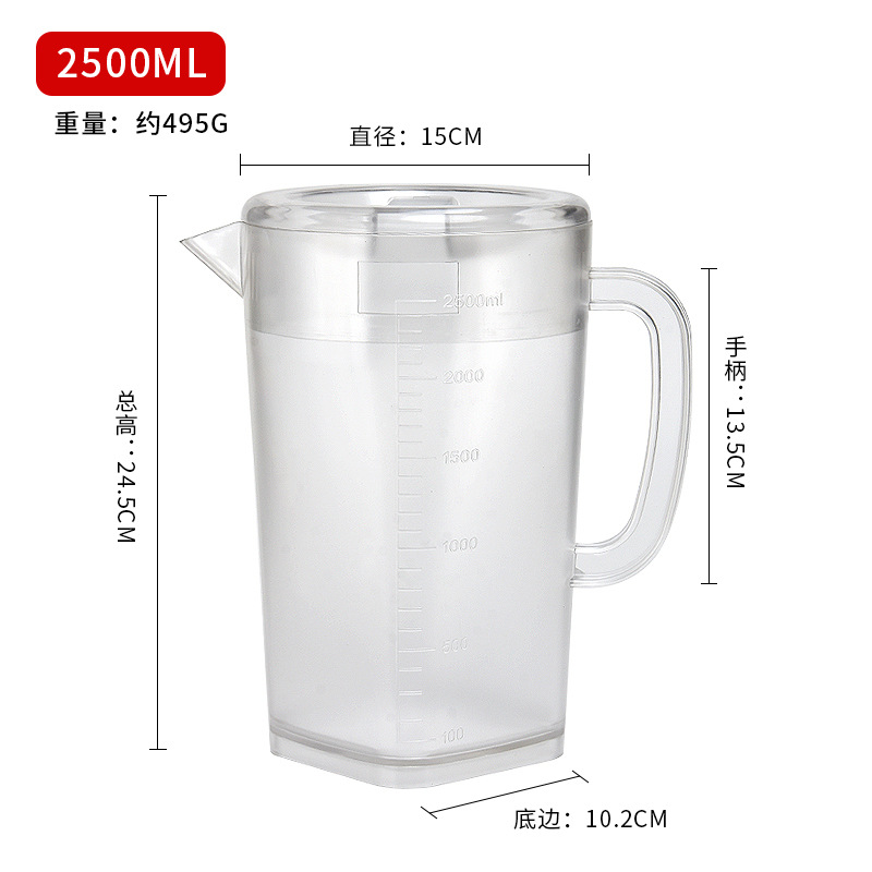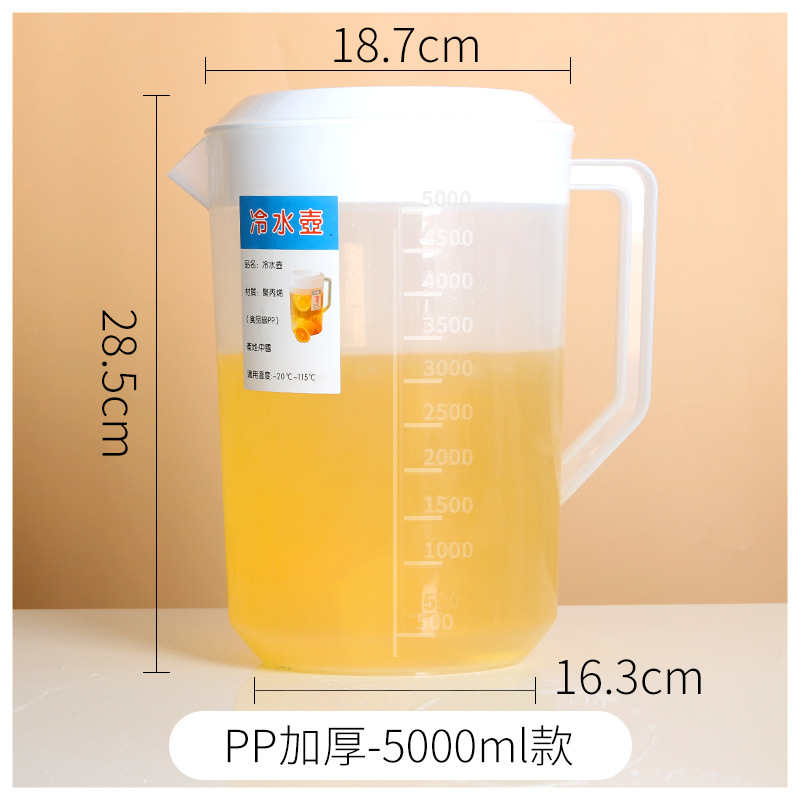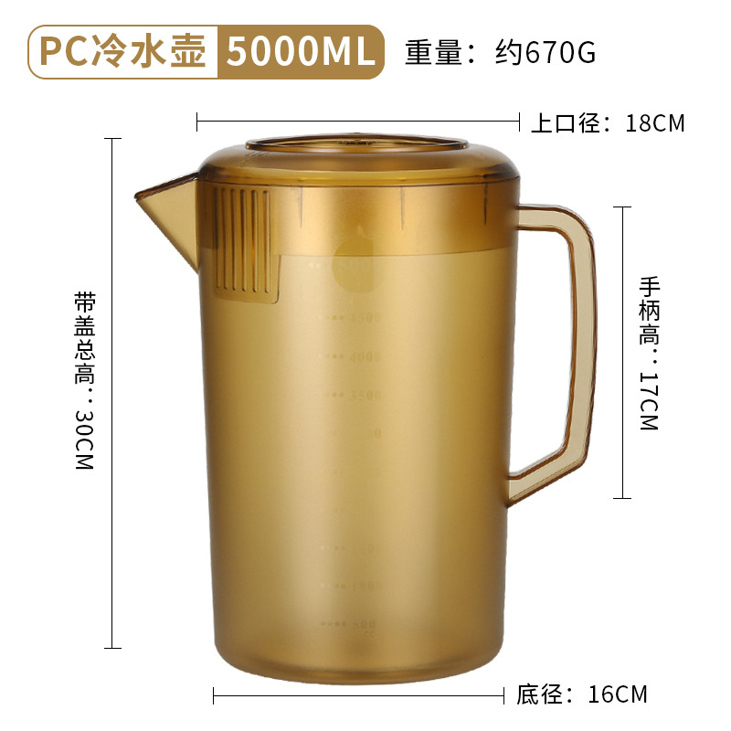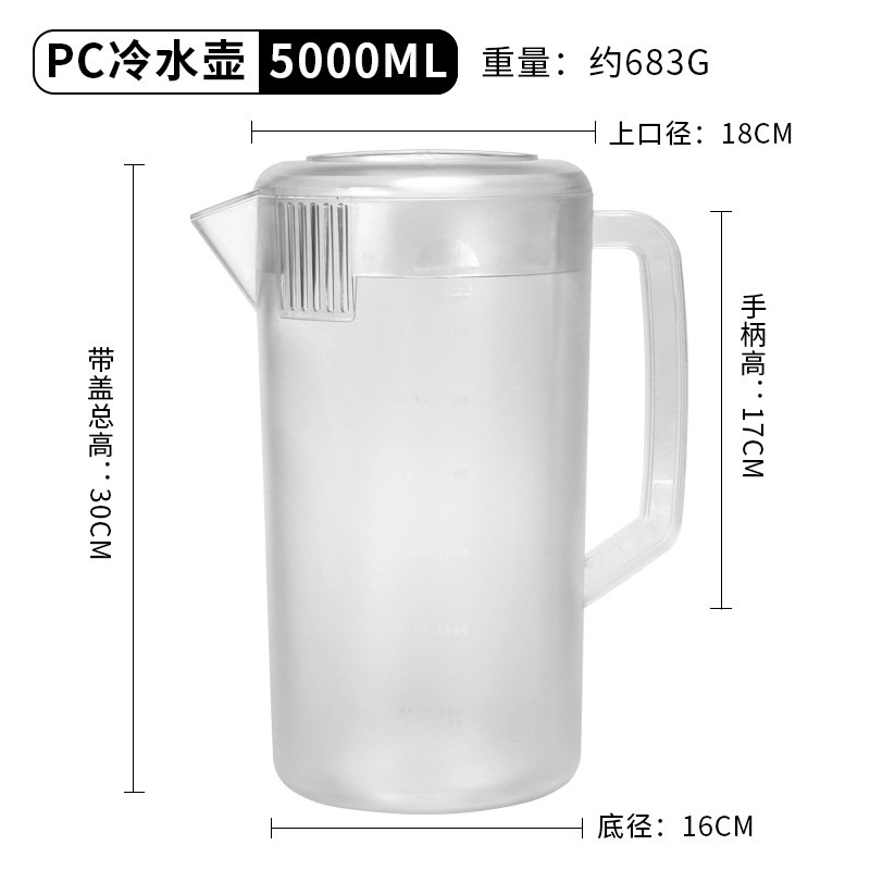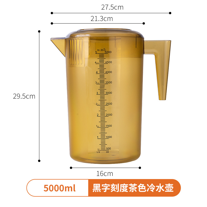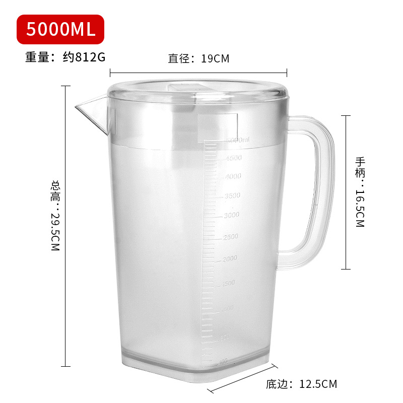 Thickened plastic cold water pitcher, heat-resistant and high-temperature durable—ideal for home use or milk tea shops; 5L large-capacity measuring cup with clear markings for cold beverages.