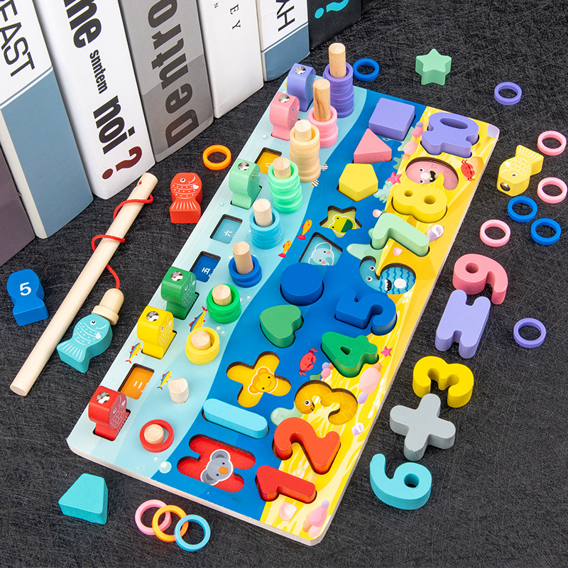 兒童木質益智五合一海洋數字運算形狀配對磁性釣魚對數板積木玩具