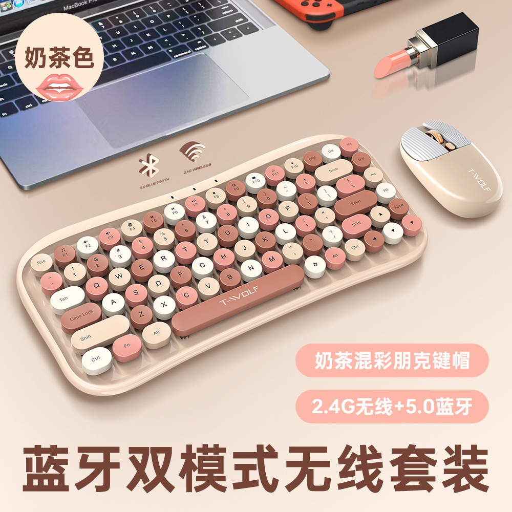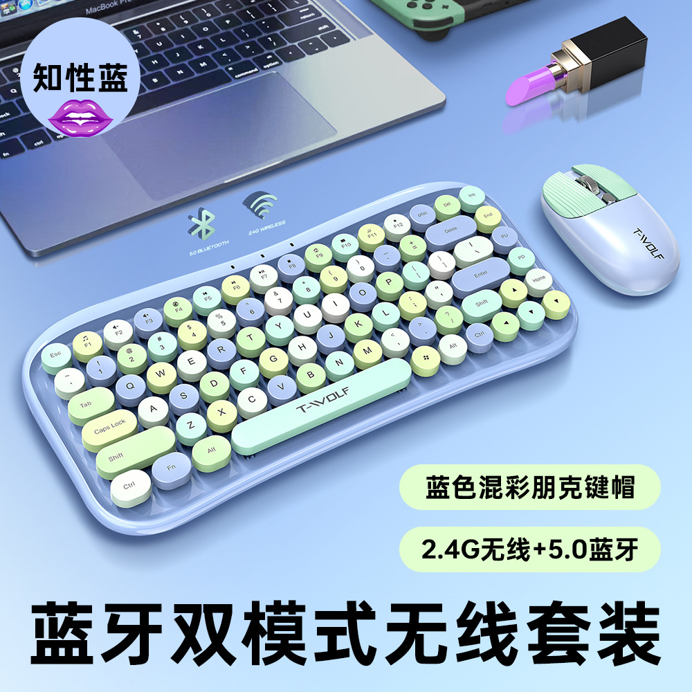 T-WOLF雷狼TF660鍵鼠套裝無線鍵盤彩色口紅女生朋克藍牙鍵盤鼠標