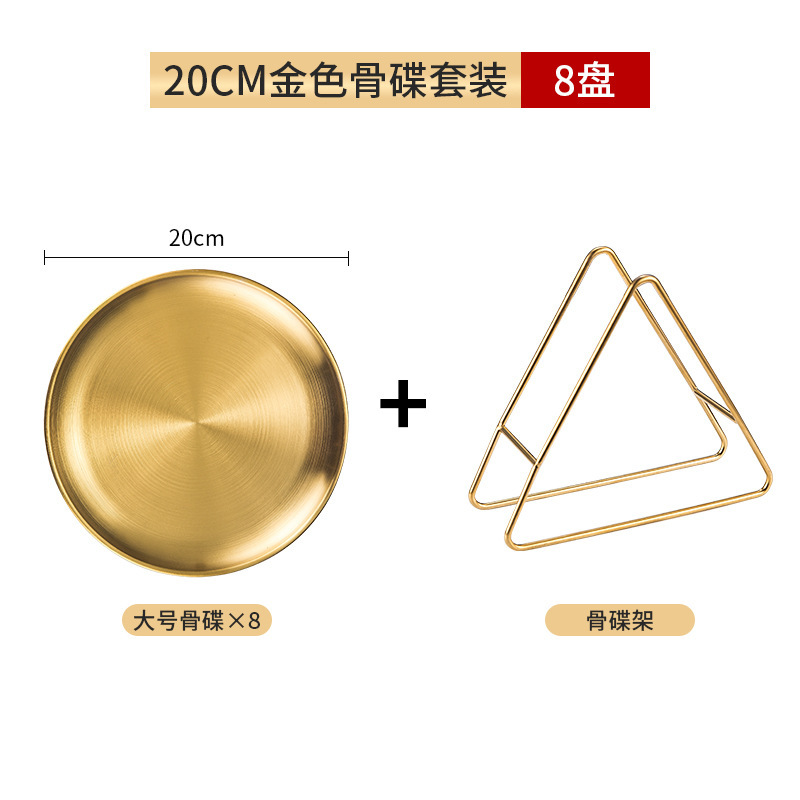 Set of 8 gold trays with stands, 20cm in diameter
