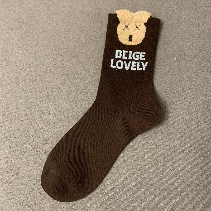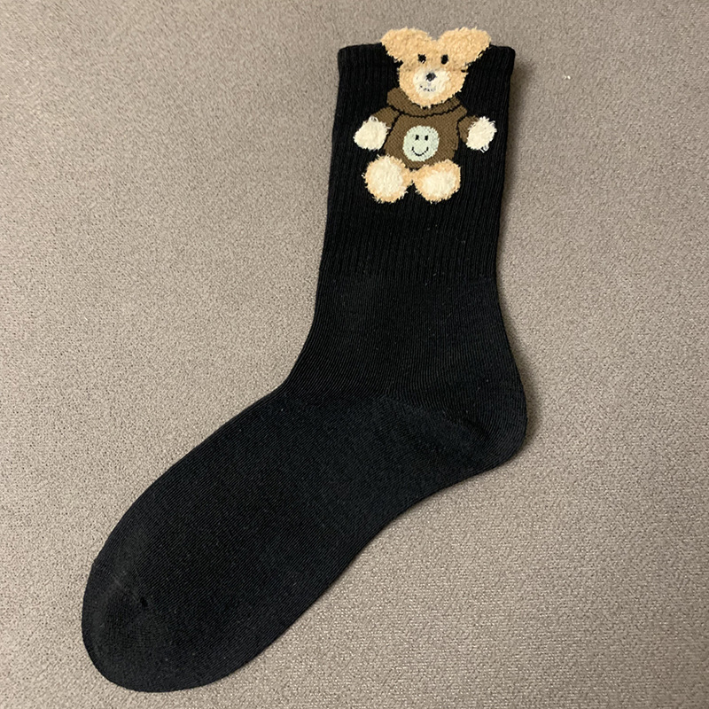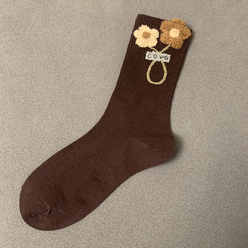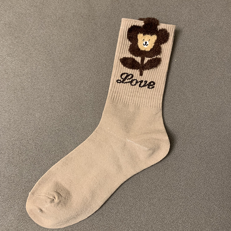 襪子女秋冬季立體毛絨小熊可愛花潮飾品網紅中長筒女襪咖黑色