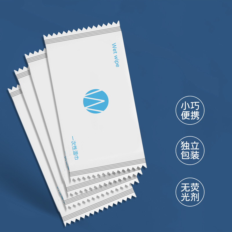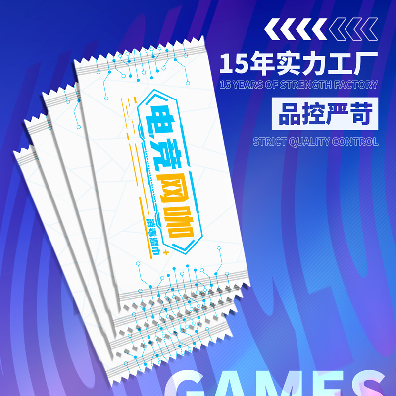 Individual sealed packaging disposable wet wipes for gaming internet cafes, moistened with disinfectant, for hygiene and cleaning purposes.