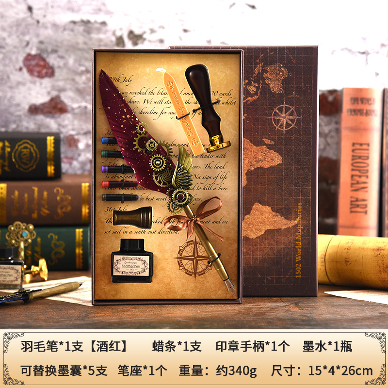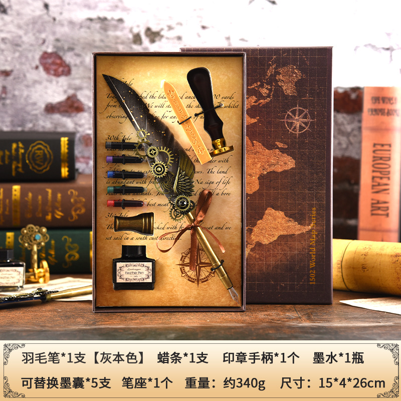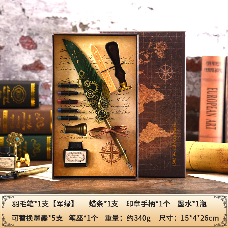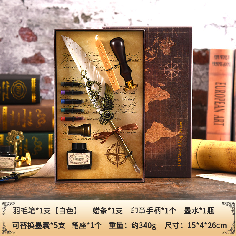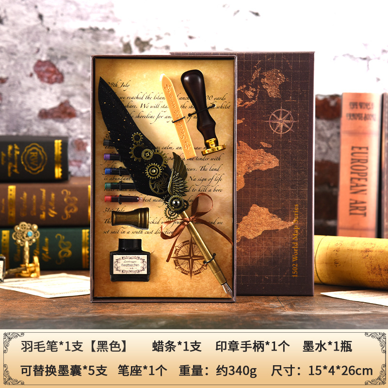 Map Mechanical Wings Steel Pen Set Ink Cartridge Pen Beeswax Hot Wax Seal Stamp Multi-purpose Gift Box Festival Gift