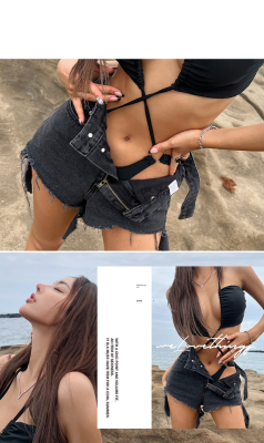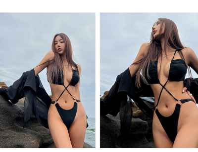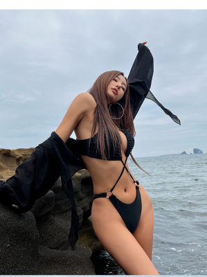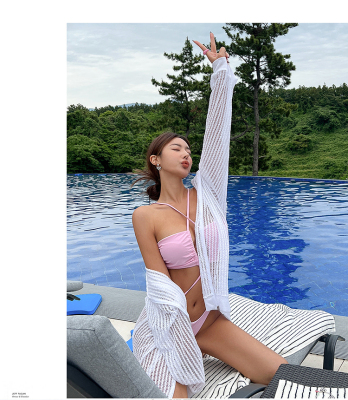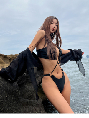 Korean women's swimwear, high-waisted triangle two-piece bikini—Instagram-style, tummy-covering, slimming, lace, sexy—vacation and hot spring swimsuit.