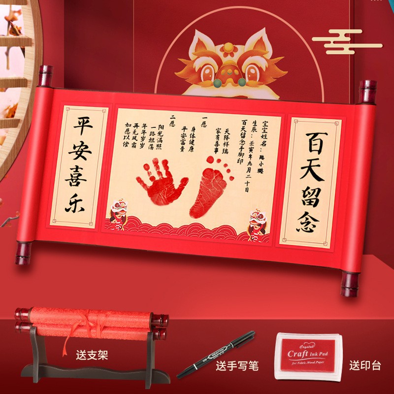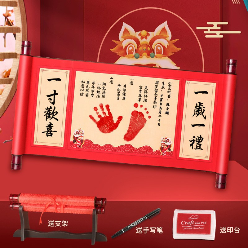 新生嬰兒滿月周歲手足印捲軸紀念一歲一禮兒童百天腳印泥留念字畫