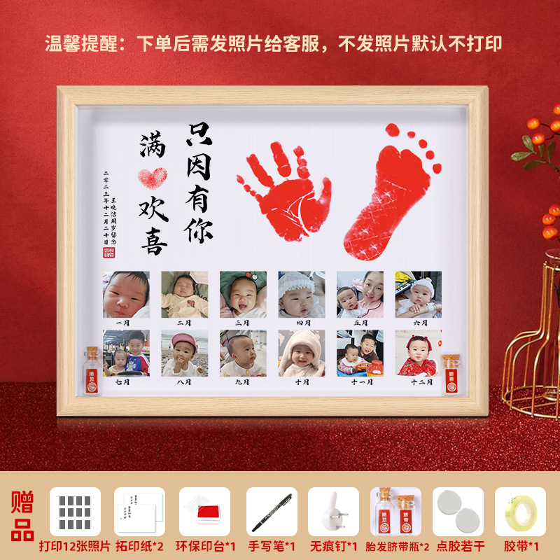 Baby's one-year-old hand and foot prints, one-year-old gift souvenir, 12-month photo, 100-day birthday arrangement photo frame