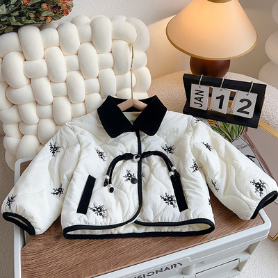 女童棉服秋冬裝2023新款小香風寶寶中式洋氣時髦碎花加絨夾棉外套