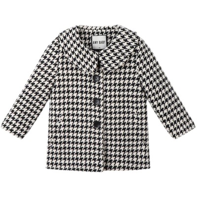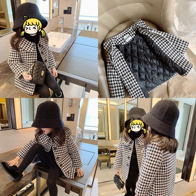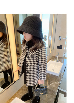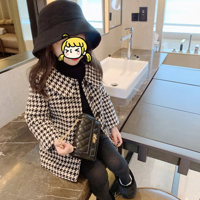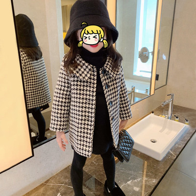 Autumn girls' mid-length houndstooth coat and windbreaker 2023 Korean style loose girl's fashionable baby woolen coat