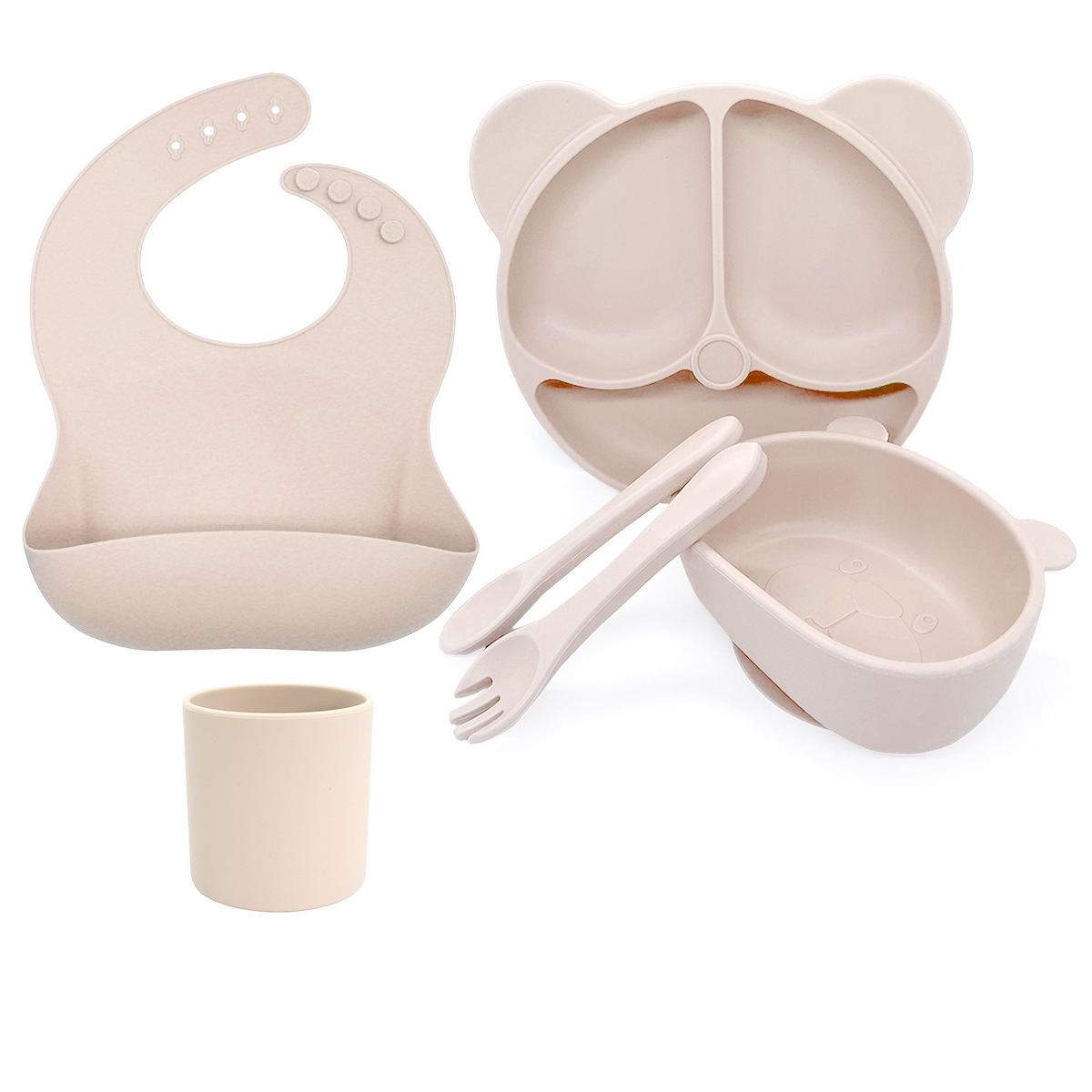 Beige 6-Piece Set - Bear Plate + Bear Bowl + Straight Cup + Bib + Long Fork and Spoon