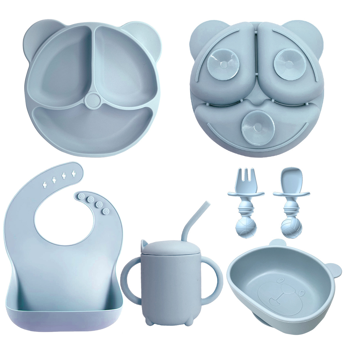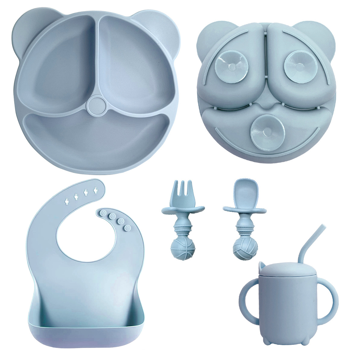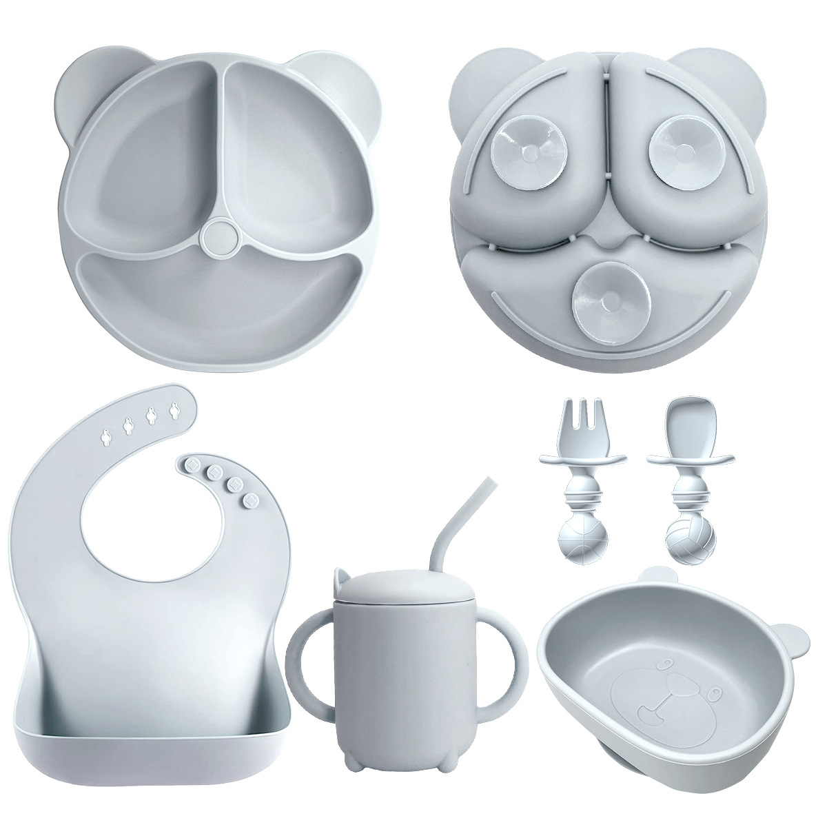Gray 8-piece - Teddy Bear Plate + Bear Head Bowl + Straw Cup + Bib + Long Fork & Spoon + Ball-shaped Short Fork & Spoon