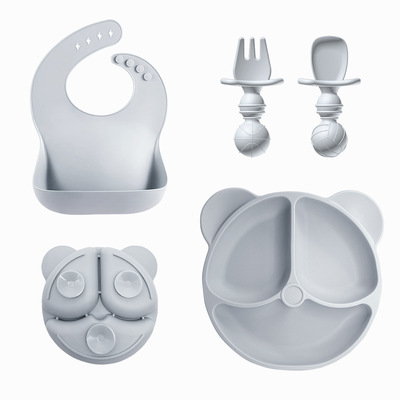 Gray 5-piece Set - Teddy Bear Plate + Straw Cup + Bib + Short Fork + Short Spoon