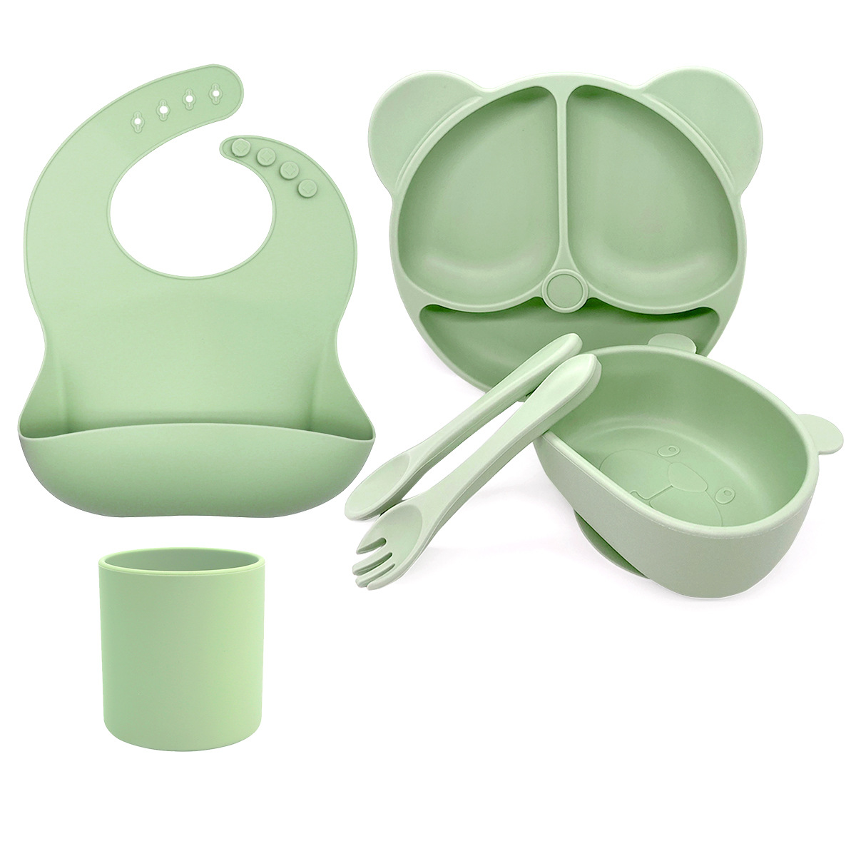 Dark Green 6-Piece Set - Bear Plate + Bear Bowl + Straw Cup + Bib + Short Fork + Short Spoon