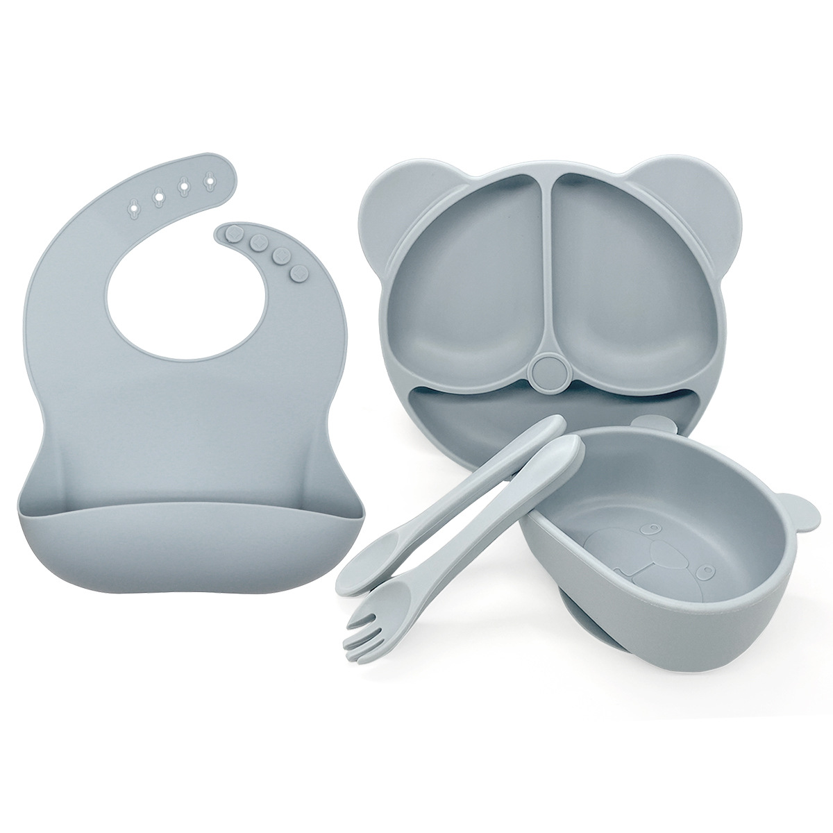 Grey 5-piece Set - Bear Plate + Bowl + Bib + Short Fork + Short Spoon