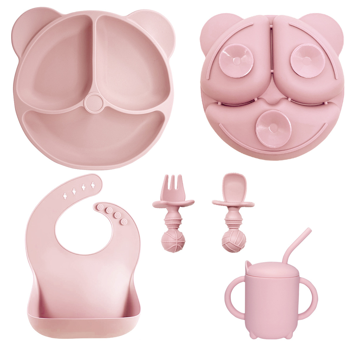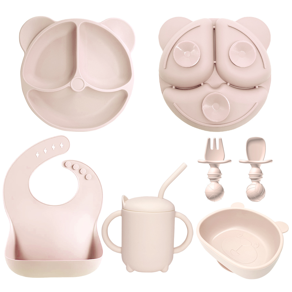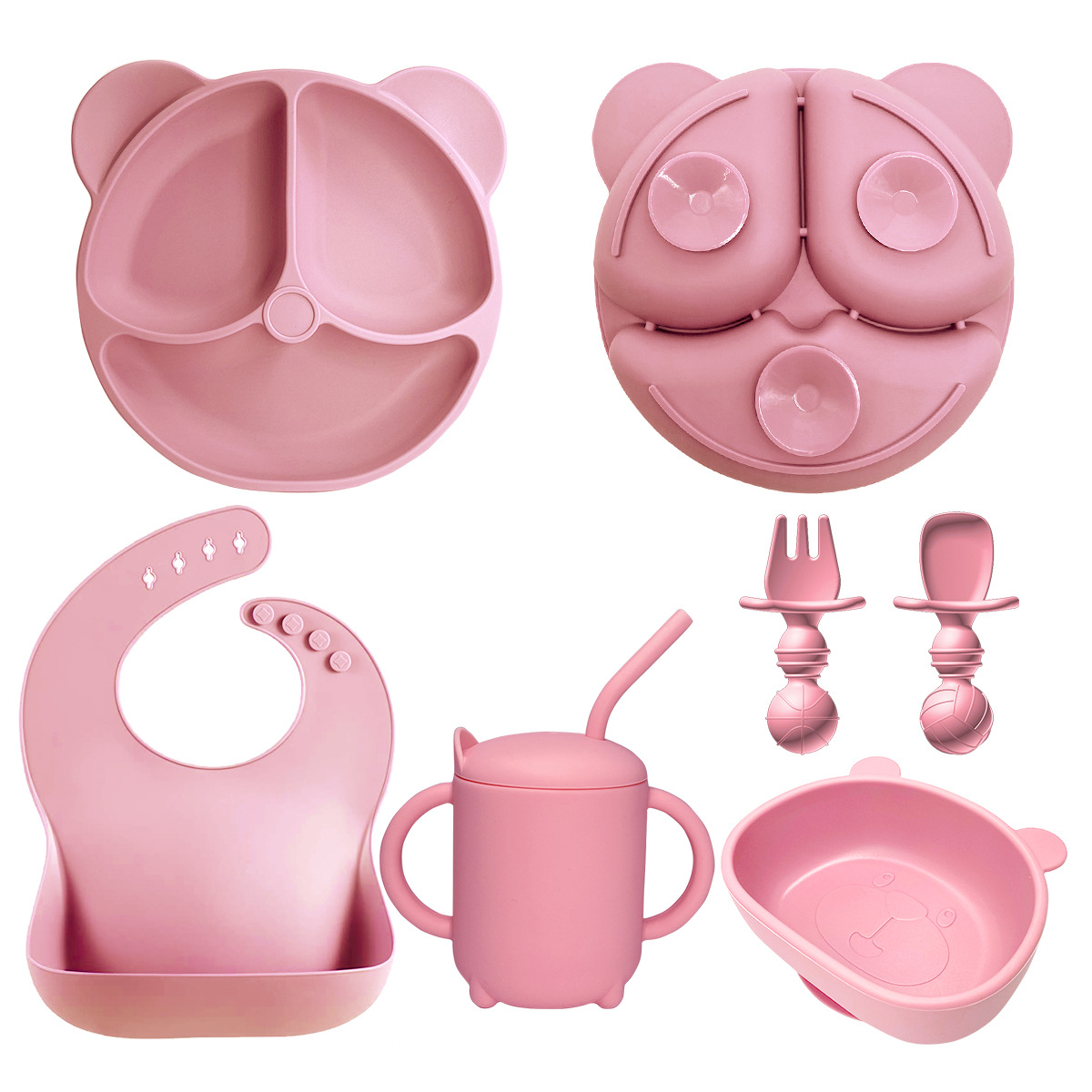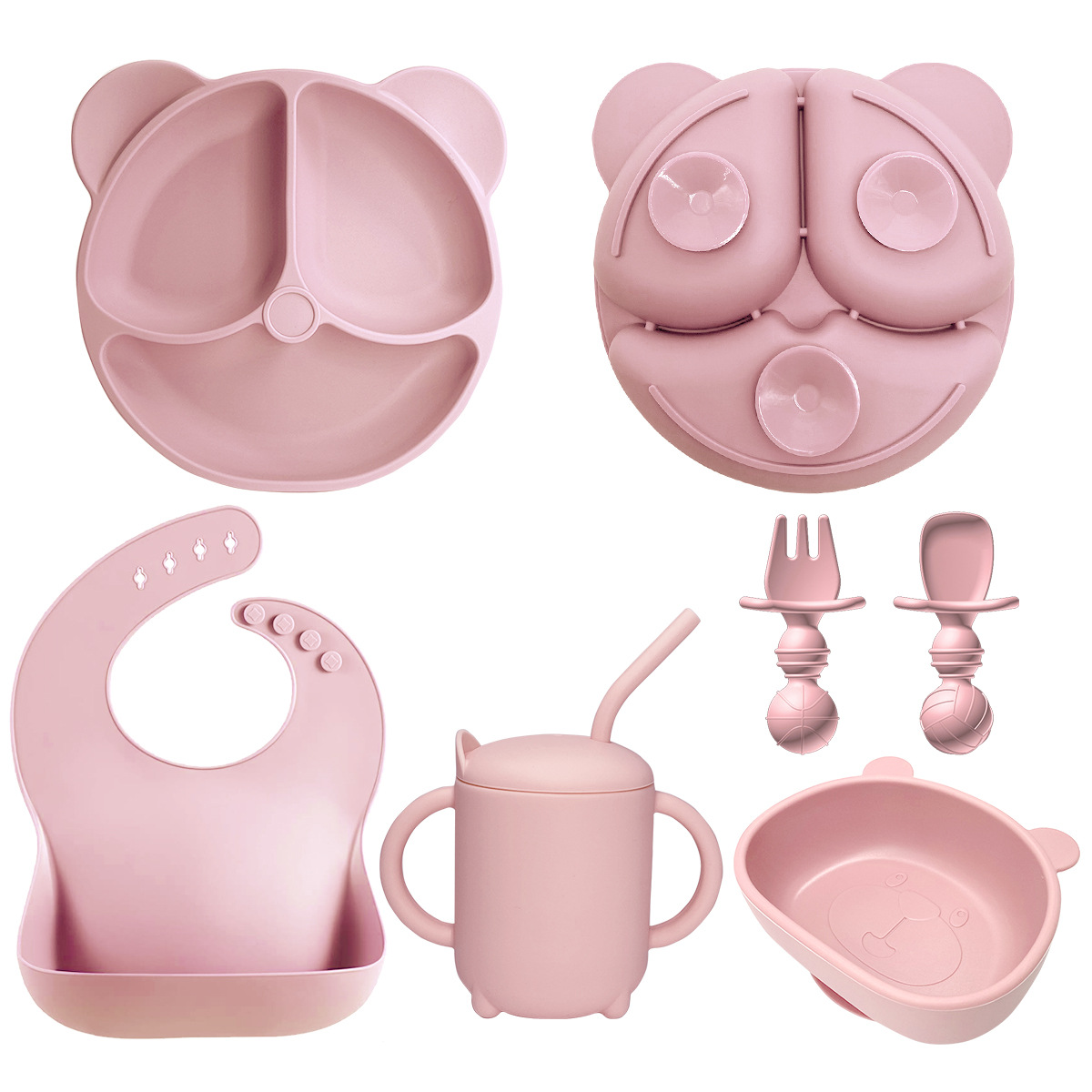 Light Pink 8-Piece Set - Bear Plate + Bear Head Bowl + Straw Cup + Bib + Long Fork and Spoon + Ball-Shaped Short Fork and Spoon
